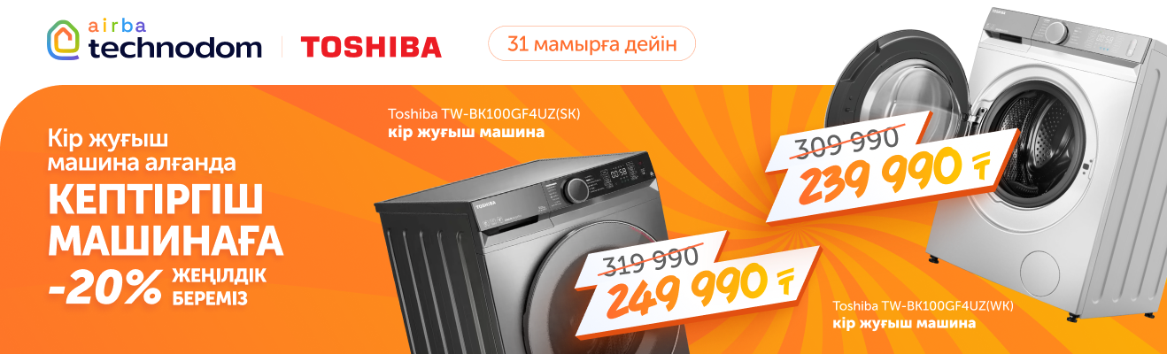 TOSHIBA кір жуғыш машинасын алыңыз — ал біз сізге кептіргіш машинаны 20% жеңілдікпен береміз!