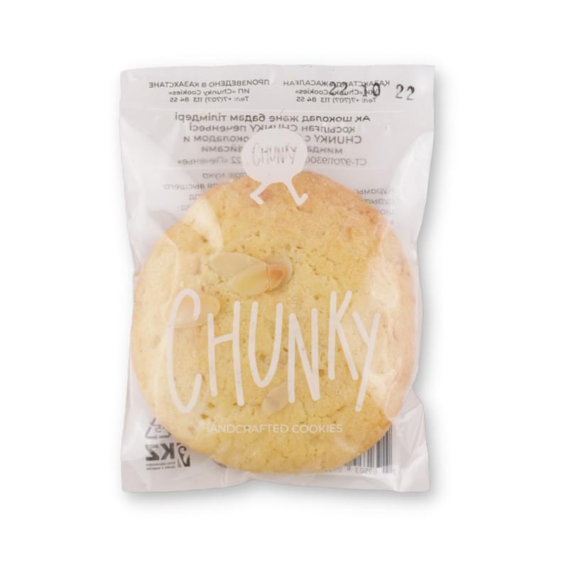 Печенье Chunky с белым шоколадом и миндальными слайсами: Печенье представляет собой высококалорийный мучной пищевой продукт с добавлением большого количества белого шоколада и миндальных слайсов. Миндаль полезен для сердца и сосудов, так как он содержит множество ненасыщенных жиров, аминокислот и минералов. Пропеченное печенье с равномерной пористой структурой, без пустот и следов непромеса. Допускается неравномерная пористость с наличием небольших пустот. Также допускаются незначительные уплотнение структуры и увеличение влажности печенья в местах, с крупными добавлениями.
