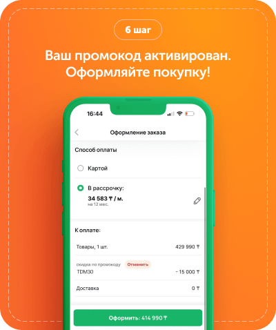 - Промокод доступен при оплате картой любого банка и при оформлении рассрочки на 3, 6 и 12 месяцев;