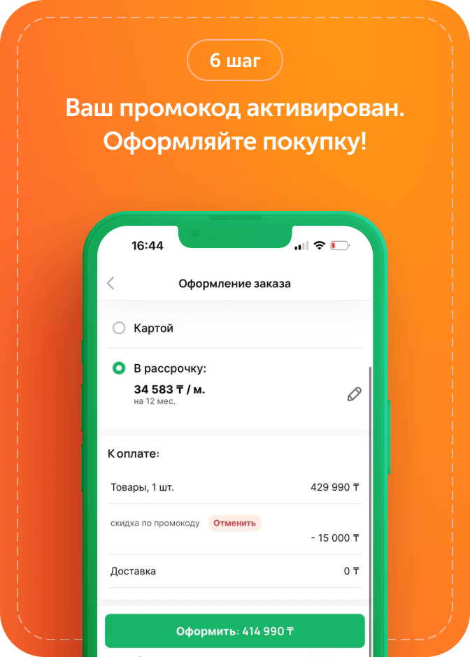 - Максимальная скидка по промокоду - 15 000 тенге;